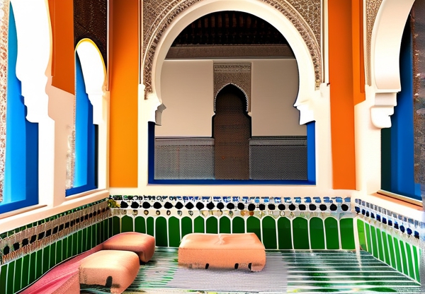 该风格最具辨识度的特征,当属独特的色彩体系:摩洛哥风格常用大地色为基调,辅以靛蓝(代表夜晚)、赭石(象征沙漠)和佩斯利绿(呼应橄榄树),通过渐变与几何分隔形成视觉冲击。建筑内部常出现的马赛克拱门,实际是设计师对传统"Zellige"瓷砖工艺的现代化转译——通过数万块几何碎片拼接出繁复花纹,这种工艺至今仍被应用在中庭装饰中。